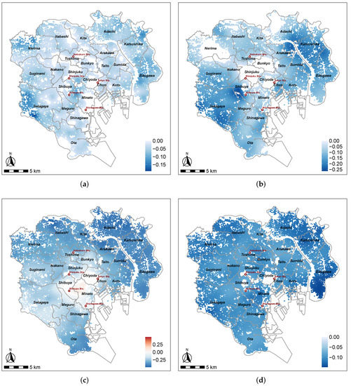 In Figure 2a, we see that as the time from the property to the nearest station increases, rent per square meter declines, which is applicable across the whole region. This negative influence presents a relatively localized spatial pattern because of the small value (0.424). From Figure 2b, compared to the time to the nearest station, coefficients regarding the accessibility to major stations change at a global scale because of the large value (1.542). The estimates are intuitively reasonable because these two properties are commonly used local and global measures to reflect the traffic accessibility. Although the accessibility to major stations encourages rental housing price growth across the Tokyo metropolitan area, significant negative values are mainly located in the northeastern and southwestern suburbs, where land use is mainly for residential and industrial purposes. In contrast, the impact is less pronounced in central Tokyo, which has a high concentration of public, political, and commercial facilities within a short distance. Thus, the high convenience of living and the diversity of demand diminish the impact of commute time on rental housing prices.