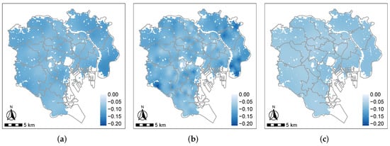 Finally, the apartment age is statistically significant across the entire study area. Although the large value (1.309) suggests a global-scale spatial heterogeneity of the apartment age, the small value (0.001) indicates that its negative impacts do not vary as drastically as other variables, consequently yielding a relatively smooth map pattern shown in Figure 2d.