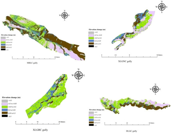 4.2. Erosion/Deposition on the Slopes and Beds of Gullies and Yearly Gully Erosion
