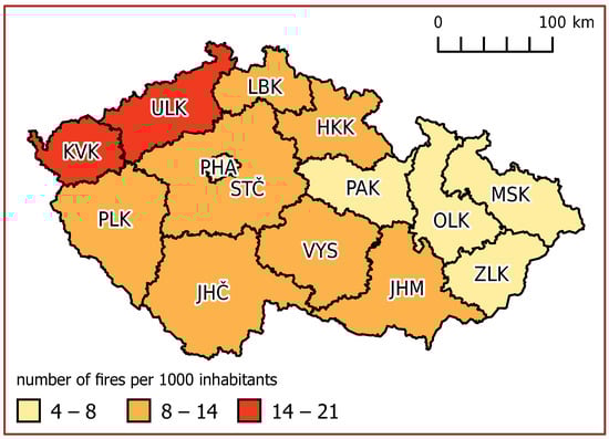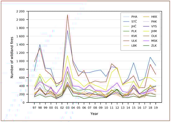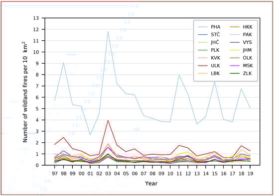 Using the number of wildland fires per region area provides us with yet another different picture of the situation. This comparison shows that, in one region—the Capital City of Prague—the situation is entirely different from the other regions, meaning that a different approach to the problem of wildland fires in this region will likely be required. We should consider the ways in which this region differs from the other regions, such as its high population density and the terrain profile (e.g., narrow river walleye carved into plains, limestone karst areas, and so on). We may even ask whether the classification of fires in this region as wildland fires is appropriate.
