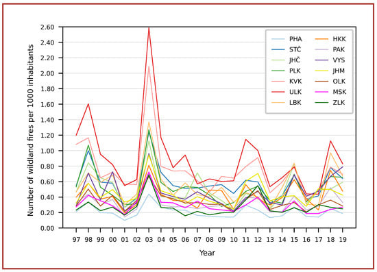 Time-series of wildland fires per 1000 inhabitants in 14 regions of the Czech Republic, including the Capital City of Prague.