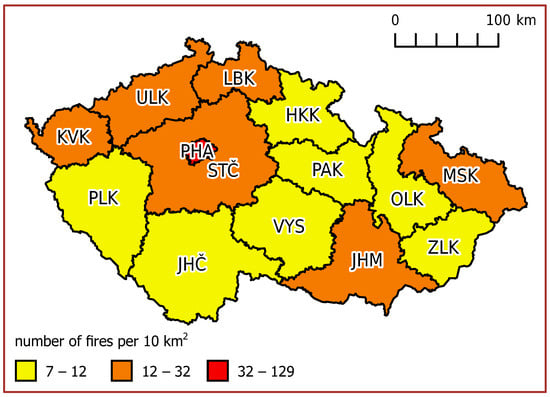 Wildland fires per per 10 km in the 14 regions of the Czech Republic, including the Capital City of Prague.