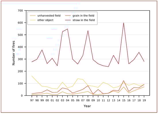 The first group consists of wildland fires of the field type. This group encompasses wildland fires on fields in various states. A close look at the number of fires by year (Figure 9) indicates that this group had one dominant component: straw in the field fires. This dominant component had a substantially higher share of fires in this group than the other groups. Moreover, the other components of this group did not follow closely its time pattern.