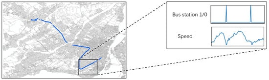 In recent years, studies show that the relationship between GPS readings and geographic information contributes to transportation mode identification. For example, the motion characteristics for the same type of vehicle may vary because they should obey the different velocity limits on the different city roads []. As shown in Figure 1, we use 1 and 0 to indicate whether there is a bus station within 100 m of the GPS readings. The velocity characteristics of this trajectory are significantly affected as it passes through the bus station. It can be seen that the motion characteristics of the trajectories in the city are affected by the surrounding facilities. It is desirable to construct the representation of the trajectories combined with their own characteristics and the surrounding geographical context [,,]. Therefore, we encode geographic information (e.g., the level of the road network, the distribution of public stations) and fuse it with the motion features of each GPS reading of the trajectories to build the trajectory embedding.