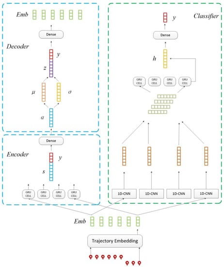 - Zhou, F.; Gao, Q.; Trajcevski, G.; Zhang, K.; Zhong, T.; Zhang, F. Trajectory-User Linking via Variational AutoEncoder. IJCAI 2018, 3212–3218. [Google Scholar] [CrossRef] [Green Version]