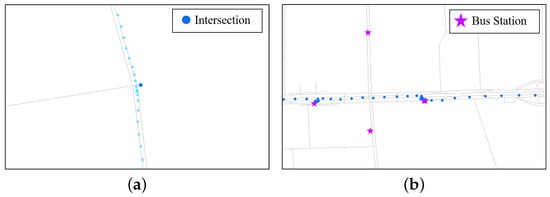 Bus stations on the road network can help distinguish between cars and public transit. The movement characteristics of cars and buses are similar, but the significant difference is that buses usually stop at stations periodically. For example, the bus trajectory shown in Figure 3b slows down near the bus stations. Therefore, we use the binary variable to represent the existence of bus stations within 100 m of the GPS reading .