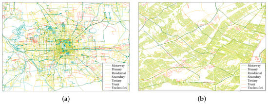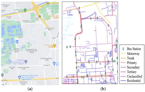 The GIS data we use is mainly come from the road network data of OSMNX []. The road networks of Beijing and Montreal are shown in Figure 4. Road network data consists of road network nodes and road network edges. Taking the Beijing road network data as an example, Table 3 shows partial data of the road network edge, and Table 4 shows partial data of the road network node. For the road network edges, we determine the level of the road network based on the value of the highway attribute, which mainly includes “motorway”, “trunk”, “primary”, “secondary”, “tertiary”, “unclassified”, and “residential”. For the road network nodes, we filter the nodes with the highway attribute values of “crossing”, “traffic_signals”, and “motorway_junction”. For the bus station data, we use a public data source to extract their coordinates. The data of bus stations in Beijing comes from public SHP files; the data of bus stations in Montreal comes from Google Transit API.
