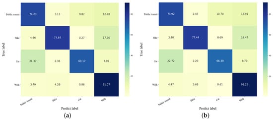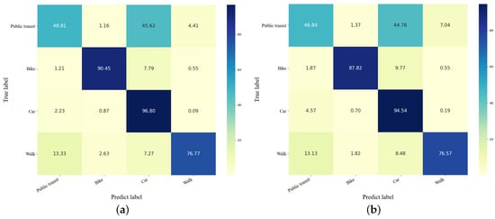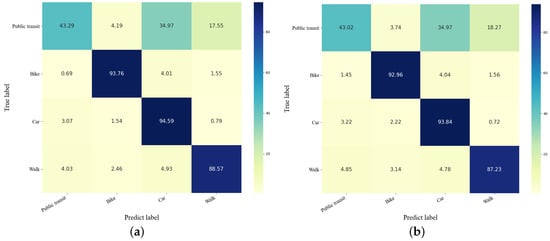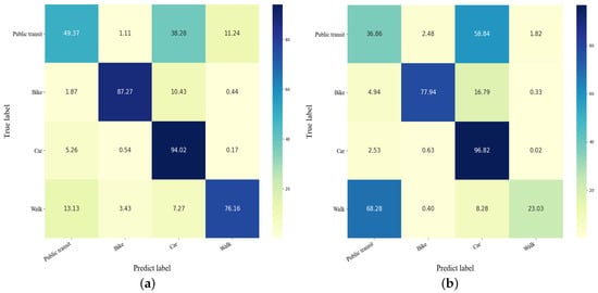 The confusion matrix of the MTL Trajet 2017 dataset. (a) Motion+GIS. (b) Motion.