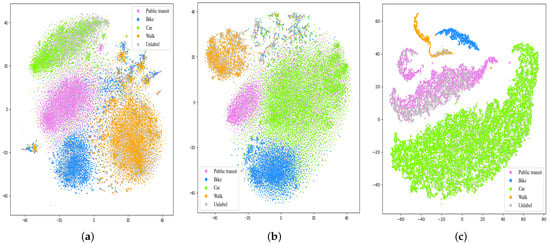 The visualization of the latent vectors. (a) Geolife dataset. (b) MTL Trajet 2017 dataset. (c) MTL Trajet 2016 dataset.
