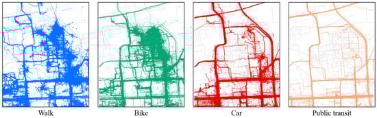 GPS readings collected from residents reflect complex urban environments and traffic conditions []. Therefore, to improve the accuracy of transport mode identification, an external GIS context, such as road traffic network, public infrastructure, or POI distribution, has been gradually introduced in some studies. Semanjski et al. pointed out that the spatial distribution represents the different traffic modes in cities []. Stenneth et al. extracted statistical characteristics of urban GIS features, such as the distance between bus stations and the residents’ locations []. Kasahara et al. used urban GIS features, such as bus lines, subway lines, expressways, and pedestrian areas []. However, these studies rely on artificial feature extraction from geographic information, resulting in their under-utilization.
