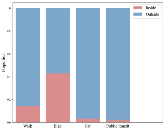 Figure 11 shows the four transportation mode trajectories identified by GeoSDVA in this area, respectively. The identification results indicate that a large number of walk and bike trajectories exist inside the university campus, while public transit and car trajectories rarely appear there. Inside the university campus, people tend to walk and use bikes, while the use of cars in this area may be limited. For a better explanation, we provide statistics for the proportion of various transportation modes inside and outside the university campus, as shown in Figure 12. In this area, about 14.3% of the trajectories are walking trajectories and 42.8% are bike trajectories inside the university campus. In contrast, only 2% of the trajectories found inside the univeristy campus are public transit ones, and 3% of them are car trajectories.In addition, we also found some other phenomena. In the northeast section of the area, there is a “Motorway” level road. Walk and bike trajectories are not identified on this road, because these two modes are not allowed to use it. We identified fewer public transit trajectories than car trajectories inside the university campus. This is because there is no bus station inside the university campus, so the bus station has become a strong support to distinguish between the trajectories of cars and public transit in this area. Moreover, we also observed that, compared with the car trajectories, the public transit trajectory appears on roads with a higher road level, which is also determined by the location of bus stations. In general, the identification results of GeoSDVA are consistent with common sense in reality, and its results have reference value.
