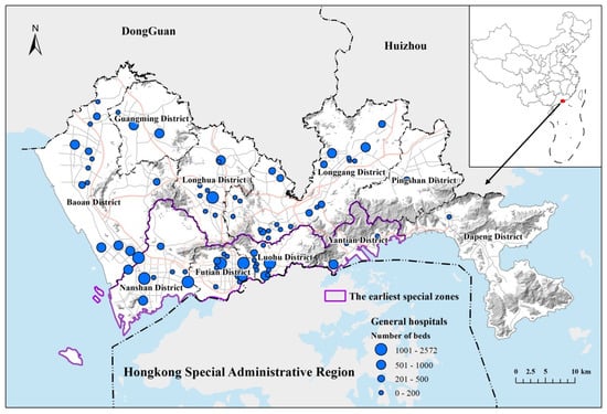 Shenzhen is a mega-city in Southern China, bordering Hong Kong to the south, with a land area of 1997 km2 and a total population of 11.91 million as of the end of 2016 []. Shenzhen was one of the first special economic zones to be established in 1980 along with the reform and opening-up of China. The city consists of ten districts, of which Futian, Luohu, Nanshan, and Yantian were the first to be included, and are therefore the most developed. Concerning healthcare, Shenzhen has established a two-level healthcare service system in which the community health service centers (CHSCs) providing primary care are configured at the community level, whereas the general hospitals (GHs) that provide comprehensive diagnoses and treatments, including secondary and tertiary care and hospitalization services, serve residents across the city. Generally, GHs are much larger and have a stronger service capacity than CHSCs (Figure 1).