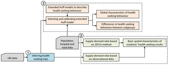 This study intends to contribute to the literature addressing these problems in three aspects. First, it aims to infer health seeking behavior based on location-based service (LBS) data, which has a finer spatial resolution and covers a larger proportion of the population than either taxi or smart card data. In addition, we propose a supply–demand ratio calculation method based on observational data to explore basic patterns of actual health seeking behavior. Second, we propose a series of extended Huff models to describe the health seeking behavior and use observational data for model selection and parameter calibration. Third, this study divides the population into heterogeneous subgroups according to age, income, and education level, an analysis of which can provide enlightening insights regarding the differences in health seeking behavior among subgroups. The proposed methods will be illustrated and validated using the city of Shenzhen, China as a case study. Finally, the discussion will build on the results regarding how to improve our understanding of health seeking behavior.