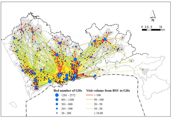 Distribution of actual health seeking trips based on big trajectory data in Shenzhen. Data source: bed number of GHs, Health Commission of Shenzhen; visit volume from BSU to GHs, trips inferred from LBS data of Tencent APPs.