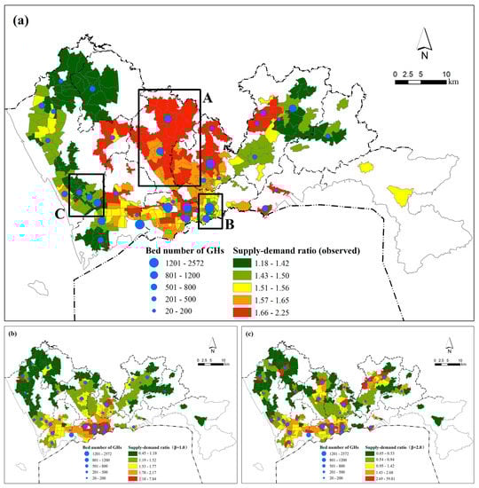 Comparison of supply–demand ratio in Shenzhen: (a) observed; (b,c) show the classical accessibility method when the decay coefficient (β) is taken as 1.0 and 2.0, respectively. Data source: bed number of GHs, Health Commission of Shenzhen; supply–demand ratio, calculated by the methods in Section 3.3.