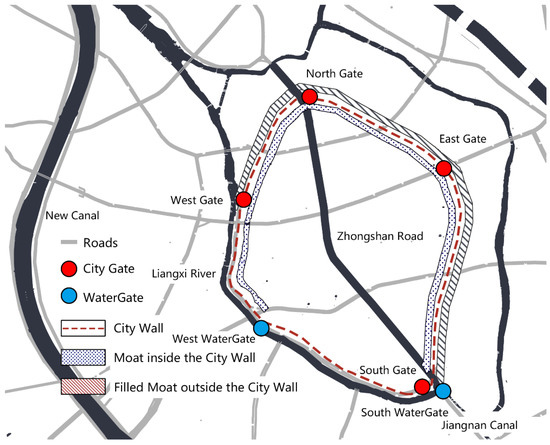 Distribution of ancient rivers in the old urban area of Wuxi. Source: Reprinted/adapted with permission from Ref. [Wuxi: A hundred-year review of a city of water in the south of the Yangtze River]. 2018, Wang, C.
