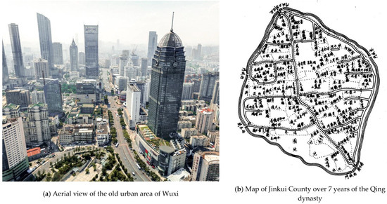 The case study was based on the old urban area of Wuxi (in Jiangsu Province, southeastern China). The reason for choosing it as a case study is that Wuxi is an important historic city in China’s South Yangtze River region. In ancient times, the river system in the old urban area of Wuxi was very well developed (Figure 2), and people lived on the river, used the water for their daily use, and traveled by the river; thus, the old urban area had a unique spatial pattern. However, in the process of urban construction, renovation methods such as filling in the river to build roads and tearing down the city wall to build roads have significantly changed the original spatial pattern of the old urban area. The spatial pattern of the old urban area of Wuxi can hardly reflect its regional characteristics due to the wide roads and large-scale modern buildings (Figure 3a).