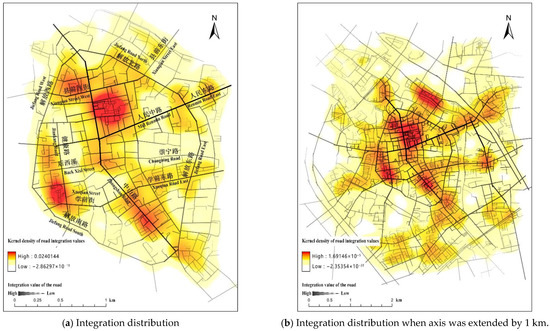 When we extended the extent of the axial map of the old urban area by 1 km in all directions, we found that the distribution characteristics of integration in the old urban area of Wuxi were unchanged with the expansion of the axial map (Figure 4). The integration of the main road and Jiefang Ring Road was high, while the integration of the collector street and the road on the periphery of Jiefang Ring Road is low. It can be concluded that the old urban area was less influenced by the spatial pattern of the periphery of the ring river and had the characteristics of independence.