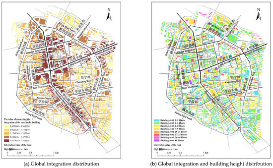 The space of the old urban area had the characteristic of coupling because the spatial classification mechanism had a self-organizing effect [27]. Commercial development will choose highly integrated areas, where buildings have a modern style and usually use modern materials such as glass curtain walls to attract people’s attention. At the same time, because the commercial space has to carry a large number of people, its building scale is huge. On the other hand, areas with low integration have not been affected by commercialization and still have traditional, pre-modern, and pragmatic buildings, small in scale and short in height.