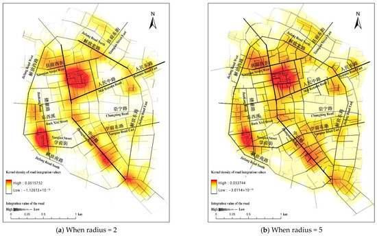On the basis of the global integration analysis of the old urban area of Wuxi, the distribution characteristics of integration in the old urban area of Wuxi indicated that the integration of the main road and Jiefang Ring Road was high, while the integration of the collector street and the road on the periphery of Jiefang Ring Road was low. There was an apparent convergence point in the space of the old urban area, which was located in the center of the urban area (Figure 4a).