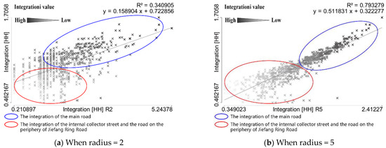 When we study the urban structure in terms of how parts of the city are accessible to each other, different radials make the urban space show different characteristics [28]. This paper investigated the spatial characteristics of the axial map of the old city of Wuxi when the radius was 2 and 5. The calculation results of the axial map under different radii represent the space’s characteristics under different travel modes. When the radius was 2, it represented the characteristics of the space when pedestrian traffic was dominant, whereas, when the radius was increased to 5, it represented the characteristics of the space when vehicle traffic was dominant. The analysis was divided into two parts. First, we ran graph analysis of the axial map with radius = 2 and radius = 5 in Depthmap software and interpreted the visualization results. Second, we analyzed the synergy of the local integration (when the radius was 2 and 5) and global integration [29] and analyzed which traffic mode had a higher synergy between local and global integration. The synergy analysis transformed the axial map into a scatter plot, expressed in Depthmap software as y = ax + b (where a is a coefficient, and b is a constant) with the R-squared value. The calculation result of the formula y = ax + b is a trend line, which is used to predict the trend of the scatter plot. The R-squared value indicates the degree of fitting.