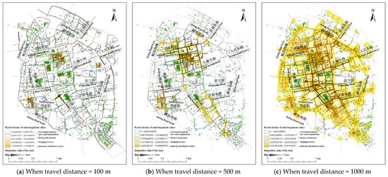 The road network closeness of the old urban area of Wuxi was analyzed using Segment Map. The road network closeness of the space showed different characteristics at different travel distances. When the travel distance was 100 m, the road network closeness of the local area around the western section of Xueqian Street and the northern section of Zhongshan Road was high, while the road network closeness of the vast majority of the urban area was low (Figure 8a). When the travel distance was 500 m, the road network closeness of Xianqian Street East, the northern section of Zhongshan Road, and Xinsheng Road in the old urban area of Wuxi was the highest, while the road network closeness of Jiankang Road and the southern section of Jiefang Road South was also relatively high. In contrast, the road network closeness of all other roads in the urban area was low (Figure 8b). When the travel distance was 1000 m, the road network closeness in the middle section of Zhongshan Road was the highest, while the road network closeness in the area around this section and the area to the north was also high; only the road network closeness in the southern section of Jiefang Road South and on the periphery of Jiefang Ring Road was low (Figure 8c).