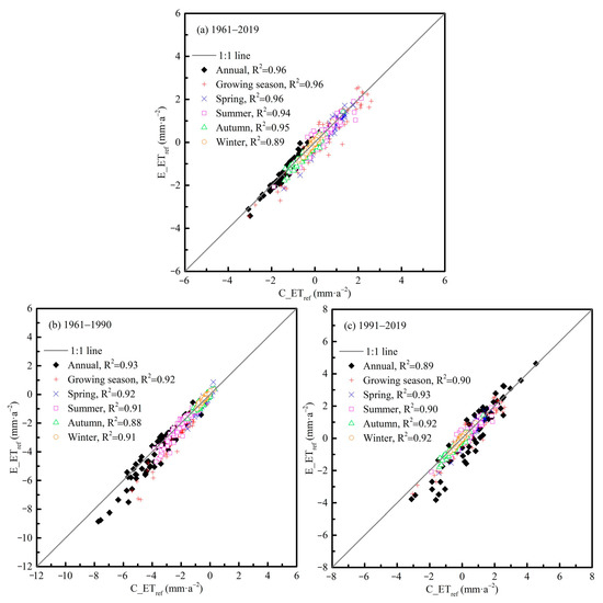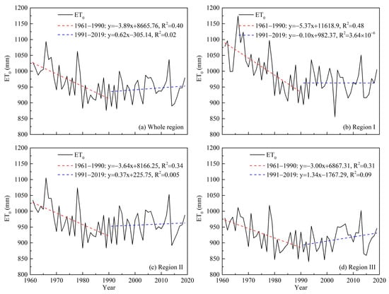 - Dong, Y.; Zhao, Y.; Zhai, J.; Zhao, J.; Han, J.; Wang, Q.; He, G.; Chang, H. Changes in reference evapotranspiration over the non-monsoon region of China during 1961–2017: Relationships with atmospheric circulation and attributions. Int. J. Climatol. 2021, 41, E734–E751. [Google Scholar] [CrossRef]