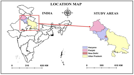Location map of the study sites: Haryana, Punjab, New Delhi, and Uttar Pradesh.