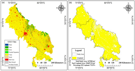 LULC of the study site for (a) year 2020 and (b) illustrates the agricultural area assessment in the selected region.
