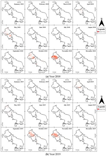 This section identifies the stubble burning months for each year by using Moderate Resolution Imaging Spectro-radiometer (MODIS) MCD64A1 data. Kharif crops are sown during early May and late June, for which fields need to be cleared of stubble, and the subsequent stubble burning (the burning of refuses after Rabi crop harvesting) can be seen during the AMJ months. Similarly, Rabi crops are sown in late October and late November, which results in quick stubble burning (the refuses from Kharif harvested crops preferably after monsoon rains) across the major parts of the country. The time gap between Rabi crop planting and Kharif crop harvesting is approximately two to three weeks, and the field needs to be prepared. This is considered to be a fast clearing method by the farmers to prepare the field for the new crops [33]. We had reviewed several published pieces of literature to precisely focus on the month when agricultural residues were burnt in the study sites [33,34,35]. Based on month-wise burned area estimation, we have defined the span period for assessing pollutants using Sentinel-5P (as shown in Table 1 and Figure 3).