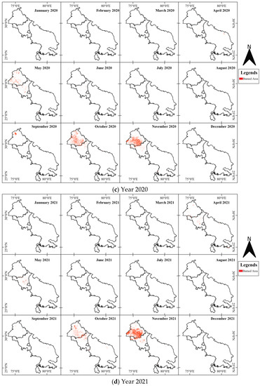 The data processed from MODIS shows that the total burned area for 2018, 2019, 2020, and 2021 are 30,422.5 km2, 27,956 km2, 27,084.5 km2, and 27,591.5 km2. In which the AMJ share for each year is 20.44%, 14.65%, 12.73%, and 9.49% (as offline/real-time data were not available for December 2021, it was reported until November 2021), respectively, and OND shares are 78.44%, 83.44%, 82.94%, and 88.84%, respectively (refer to Figure 4). As seen in Figure 4, April–May–June and October–November–December during 2018, 2019, 2020, and 2021 correspond to the highest burned area in the study site, as seen in Table 2.
