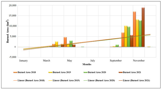 Graphical representation of the monthly burned area for the study site for three different years 2018, 2019, 2020, and 2021.