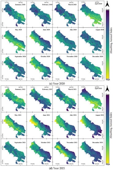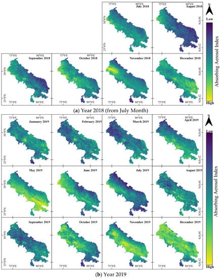 AAI is the aerosol absorbing Index; Rmeas depicts measured reflectance at wavelengths λ1 and λ2; Rcalc describes calculated reflectance from the atmosphere with Rayleigh scattering; ALER is the Lambert equivalent reflectivity, which is the measured reflectance for wavelength λ2. The aerosol concentration range varies from −21 (min) to 39 (max). The aerosols that absorb light (dust and smoke) are represented by positive values of the Aerosol Index, while tiny or negative values represent non-absorbing aerosols and clouds. If the Index of refraction, particle size distribution, and the height of the aerosol layer are known from previous measurements, the Index can be interpreted in terms of optical depth [38].