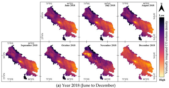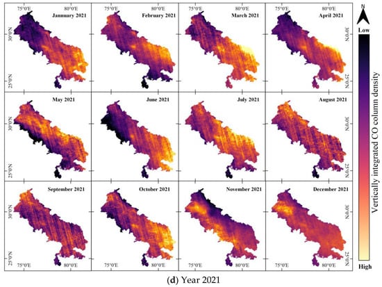 The column sensitivity changes according to the light path for cloudy atmospheres and is thus easy to estimate using SP5 datasets. Here, Sentinel-5P is employed to estimate the vertically integrated CO column density at 0.01 arc degrees, which provides the CO concentrations ranging from a minimum of 0.01 to a maximum reported value of 5.71 mol/m2. Offline CO data from June 2018 to December 2021 were collected for analysis. Figure 6 illustrates the CO concentration from November 2018 to November 2021. The results showed that the maximum concentrations were seen in April, May, and June (AMJ) and during winter, October through to December (OND months) each year. The average value of CO concentration in the study area was found to be 4.6 × 10−2 mol/m2. The CO concentrations for the AMJ months are found to be 4.8 × 10−2, 4.54 × 10−2 and 4.59 × 10−2 for the years 2019, 2020, and 2020 while, it was found to be 5.16 × 10−2, 4.98 × 10−2, 5.44 × 10−2 and 5.46 × 10−2 mol/m2 for the OND months for the years 2018, 2019, 2020, and 2021, respectively. The results concluded that CO concentrations were found to be slightly higher in thr OND months (winters) as compared to AMJ months in each year, as seen in Figure 6.