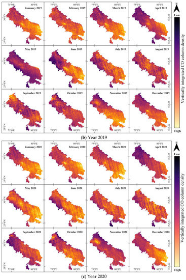 The Carbon Monoxide Product is used to estimate the total column that needs to be retrieved for background CO abundance and surface reflection. A physics-based retrieval approach was used to derive the scattering properties of the observed atmosphere and associated trace gases in the atmosphere [39]. Carbon monoxide (CO) is an important atmospheric trace gas for understanding tropospheric chemistry. In some urban regions, it is a major atmospheric pollutant. The primary sources of CO are the combustion of fossil fuels, biomass burning, and the atmospheric oxidation of methane and other hydrocarbons. Whereas fossil fuel combustion is the primary source of CO in northern mid-latitudes, the oxidation of isoprene and biomass burning play an essential role in the tropics. TROPOMI on the Sentinel 5 Precursor (S5P) satellite observes the CO global abundance exploiting clear-sky and cloudy-sky Earth radiance measurements in the 2.3 µm spectral range of the shortwave infrared (SWIR) part of the solar spectrum [40]. S5P TROPOMI clear sky observations provide CO total columns sensitive to the tropospheric boundary layer [41].
