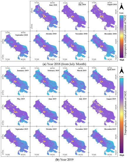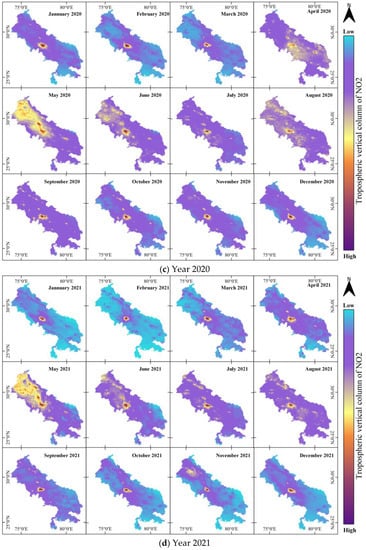Oxides of nitrogen (such as nitrogen dioxide (NO2) and nitrogen oxide (NO)) are significant trace gases that are the end products of anthropogenic sources as well as natural processes. These are emission gases that are harmful to the atmosphere, which cause smog, acid rains, and other related problems. Nitrogen oxides (NO2 and NO) are important trace gases in the Earth’s atmosphere, present in the troposphere and the stratosphere. These gases enter the atmosphere due to anthropogenic activities (fossil fuel combustion and biomass burning) and natural processes (wildfires, lightning, and microbiological processes in soils) [42]. Here, NO2 is used to represent the concentrations of collective nitrogen oxides because during the daytime, i.e., in the presence of sunlight, a photochemical cycle involving ozone (O3) converts NO into NO2 and vice versa on a timescale of minutes. The TROPOMI NO2 processing system is based on the algorithm developments for the DOMINO-2 product, and the EU QA4ECV NO2 re-processed dataset for OMI and has been adapted for TROPOMI. This retrieval-assimilation-modelling system uses the three-dimensional global TM5-MP chemistry transport model at a resolution of 1 × 1 degree as an essential element. Here, Sentinel-5P is employed to estimate the total vertical column of NO2 (ratio of the slant column density of NO2 and the total air mass factor) at 0.01 arc degrees. The tropospheric NO2 column number density ranges from minimum values of −5.37 × 10−4 to maximum reported values of 1.92 × 10−2 (mol/m2). However, from December 2020 onwards, there have been changes and improvements in the S5P NO products [43,44,45]. The offline NO2 data from June 2018 to December 2021 were collected for analysis (refer to Table 1 for more information). Figure 7 demonstrates NO2 concentration from November 2018 to November 2021. The results showed that maximum concentration was seen in April, May, and June (AMJ) and during winter, October through to December (the OND months of each year). The concentration in winter is slightly higher than the AMJ months in each year, as seen in Figure 7. The amount of NO2 in the atmosphere is linked to several emission sources, such as vehicular emissions and natural sources. The average NO2 concentration in the study area was found to be 2.02 × 10−4 mol/m2. The concentrations for the AMJ months are 1.27 × 10−4, 1.75 × 10−4, 9.32 × 10−5 and 1.26 × 10−4 mol/m2 and for the OND months are 3.37 × 10−4, 2.87 × 10−4, 2.26 × 10−4 and 2.62 × 10−4 mol/m2 for the years 2018, 2019, 2020, and 2021, respectively.