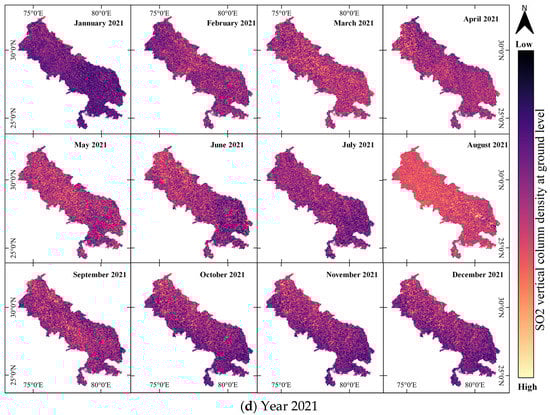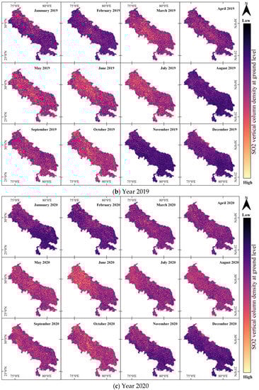 Sulfur dioxide (SO2) enters the Earth’s atmosphere through natural and anthropogenic processes. It plays a role in chemistry on a local and global scale, and its impact ranges from short-term pollution to effects on the climate. The sources of the increased concentration of SO2 in the atmosphere are attributed to anthropogenic sources, vehicular emissions, biomass burning, and fossil fuels combustion) [46] and natural phenomena (lightning, forest fires, microbial activities, and other means). Only about 30% of the emitted SO2 comes from natural sources; most are anthropogenic. SO2 emissions adversely affect human health and air quality. SO2 affects climate through radiative forcing via the formation of sulfate aerosols. Volcanic SO2 emissions can also pose a threat to aviation, along with volcanic ash. S5P/TROPOMI samples the Earth’s surface with a revisit time of one day with an unprecedented spatial resolution of 3.5 × 7 km, which allows the resolution of fine details, including the detection of much smaller SO2 plumes. More information about the datasets and their processing can be checked at GGE.