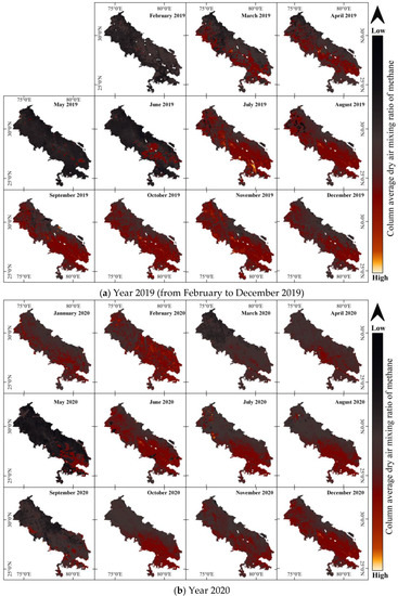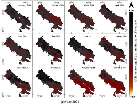 Methane (CH4), after carbon dioxide (CO2), is the largest contributor to greenhouse gases (GHGs) from anthropogenic emissions, which causes a global warming effect [30,47]. Roughly three-quarters of CH4 emissions are anthropogenic, so it is essential to continually record satellite-based measurements. TROPOMI aims to provide CH4 column concentrations with a high sensitivity to readings from the Earth’s surface, good spatiotemporal coverage, and sufficient accuracy to facilitate the inverse modelling of sources and sinks. The offline CH4 data from February 2019 to December 2021 were collected for analysis. TROPOMI uses absorption information from the Oxygen-A Band (760 nm) and the SWIR spectral range to monitor CH4 abundances in the Earth’s atmosphere [48]. Some filters need to be applied to remove the bad pixels, but filtering on a value of <0.5 does not remove all the pixels considered useless. Some pixels with too low of a methane concentration are still present: (a) Single TROPOMI overpasses show stripes of erroneous CH4 values in the flight direction. Secondly, not all pixels above inland bodies of water are filtered out. Here, Sentinel-5P is employed to estimate methane’s column-averaged dry-air mixing ratio at 0.01 arc degrees, ranging from 1491 to 2352 (ppbV) (refer to Figure 9). The average CH4 was found to be 1967.12 ppbV for the study area and for the AMJ months 1999.153, 1965.32, and 1956.627 ppbV, and in the OND months it was observed to be 1952.167, 1978, and 1988.55 ppbV for 2019, 2020, and 2021, respectively.