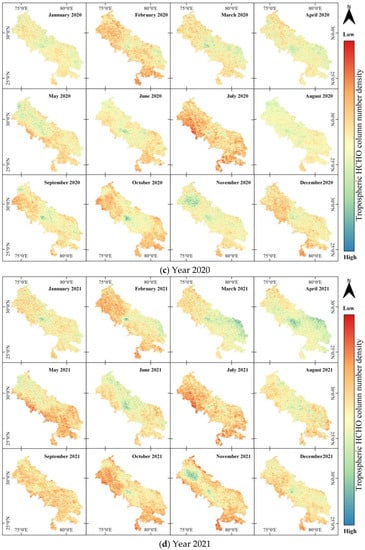 Formaldehyde (HCHO) is one of the major hazardous air pollutants (HAPs) [50,51] among the 187 pollutants (HAPs) that are also known for their carcinogenic effect in outdoor environments [52]. HCHO is an intermediate gas in almost all oxidation chains of non-methane volatile organic compounds leading eventually to the formation of CO2 and the concentration of CO2 in the atmosphere. It also acts as an important precursor to Tropospheric O3 concentration. These compounds are released into the troposphere by the oxidation of higher non-methane volatile organic compounds emitted mainly from vegetation, fires, and traffic. People are generally exposed to surface concentrations of HCHO, which are directly related to health risks. Detailed information about its hazardous nature and health impact can be found in published works of literature [50,51]. Considering the hazardous impact, systematic and accurate ground-based monitoring is difficult and associated with several limitations (expensive, associated errors, small scale-point data) [53]. Most countries are facing the problem of ground instruments for HCHO sampling, except the USA, which uses a HAPs sampling network, but is limited to urban regions. There is a requirement for the spatio-temporal monitoring of HCHO at different levels, from the local to a global scale [54]. Therefore, space-borne datasets are suitable for monitoring HCHO and are also supported by Sentinel-5P Tropomi for larger-scale surveillance with effective and accurate outcomes (the maximum achievable value for HCHO concentration was reported to be 0.0074 mol/m2). Satellite datasets were utilised for mapping HCHO distribution by [55]. Offline HCHO data from December 2018 to December 2021 were collected for analysis (refer to Table 1 for more information). According to the technical user guides available with the cloud computing engine, data points whose quality index (QA-value) was less than 0.5 were removed in order to ensure the best quality of output [56]. Our results show that HCHO’s average concentration is 3.8 × 10−4 mol/m2 over the study sites (refer to Figure 11). The maximum Tropospheric HCHO column number density is found to be 1.31 × 10−5, 3.72 × 10−4 and 2.10 × 10−5 mol/m2 during the AMJ months for the years 2019, 2020, and 2021 while the concentration is 3.92 × 10−4, 4.02 × 10−4, 4 × 10−4, and 4.6 × 10−4 mol/m2 for the OND months of the year 2018, 2019, 2020, and 2021. Furthermore, the HCHO concentration was found to be highest in the southern parts of Haryana, western parts of Punjab, a few parts of Delhi, and the eastern part of UP.