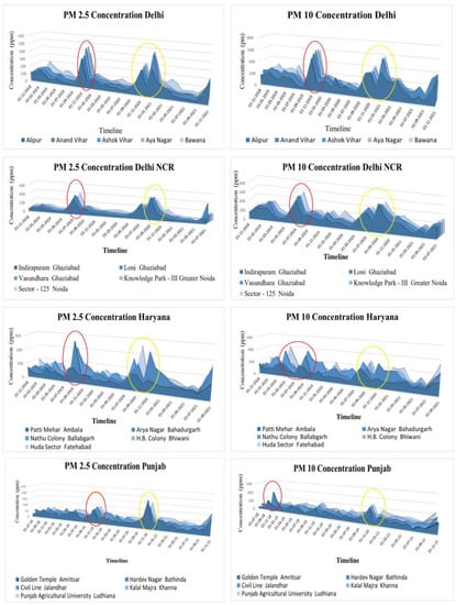 Apart from satellite estimation, we have collected the ground samples for the major air pollutants through several agencies, such as the CPCB, for the selected pollutants, PM2.5 and PM10. Figure 12 demonstrates that the concentration is only high in the months following the stubble burning in the vicinity of the states mentioned earlier. In Delhi, the PM emitted by burning stubble is 17 times higher than that emitted by all other sources, including vehicle emissions, the burning of waste, and factories [57]. The wind speed is the most important parameter that influences the concentration of particulate matter and its transport from the source point to other locations [58]. Due to the lightweight nature of particulate matter, it floats in the air for a longer time and travels over longer distances; weather conditions amplify the effect of particulate matter by forming smog [59,60]. The annual contribution of PM2.5 and PM10 is shown in Figure 11. From the different stations of the study sites, it is clear that the concentration of PM2.5 and PM10 is high in the AMJ months and higher in the OND months due to the stable environment. The circles that are highlighted in the graph (refer to Figure 12) represent the particular time that has been used to demonstrate the PM2.5 and PM10 graphs of the Haryana, Punjab, and Delhi areas. It can be concluded that during the AMJ and OND months, the peaks are highest in Haryana and Punjab, as well as some parts of Delhi NCR.