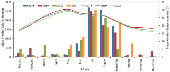 Mean monthly rainfall during years 2018 to 2021 and mean monthly temperature during years 2018 to 2020 for the study site (lines represent temperature and bars represent monthly rainfall data).