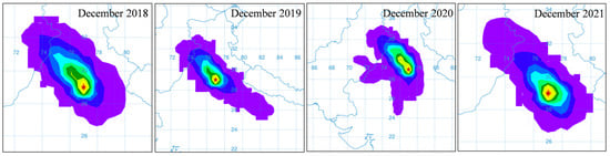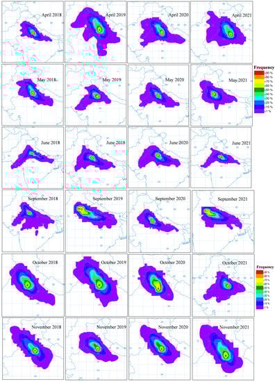 Frequency of backward trajectories during April–June for 2018, 2019, 2020, and 2021. Frequency of backward trajectories from September to December for 2018, 2019, 2020, and 2021.