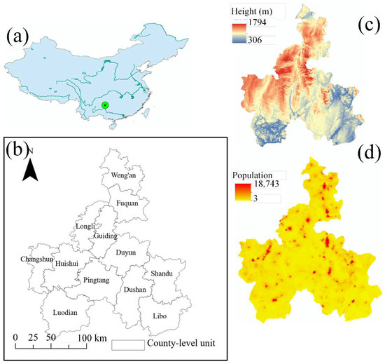 Qiannan Buyei and Miao Autonomous Prefecture (Qiannan), located in the south central area of Guizhou Province in China and near the province’s capital city Guiyang (Figure 1a), is set as the study area. Qiannan belongs to the slope zone from Guizhou Plateau to Guangxi Hills; hence, its terrain is higher in the west and lower in the east, with the maximum height difference reaching 1719 m (Figure 1c). The mean elevation of Qiannan is 997 m, which is lower than the province’s average elevation of 1107 m [22]. The low-lying terrain, along with its subtropical monsoon climate, causes the complex and varied land surface that is characterized by peak forests, peak clusters, trough valleys, depressions, and water holes. Qiannan shows a typical subtropical humid monsoon climate, with an annual average temperature ranging from −19.6 °C to 13.6 °C and the annual precipitation reaching 1200 mm. These characteristics make Qiannan one of the areas with the highest precipitation. With a total area of 26,200 km2, Qiannan includes 12 county-level administrative units (two county-level cities, nine counties, and one autonomous county), as shown in Figure 1b. According to the seventh census of China, Qiannan has approximately 3.49 million long-term residents as of November 2021, and the ethnic minority population accounts for about 59% of the total population (Figure 1d).