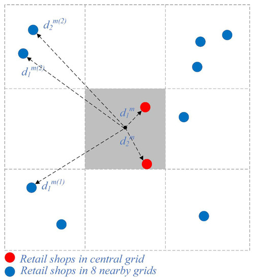 where denotes the distance of the central point to shop , which is in grid ; denotes the total number of retail shops in grid ; denotes the average distance from the central point to all the shops located in grid . Similarly, we calculated the average distance from the central point to shops located in eight nearby grids: