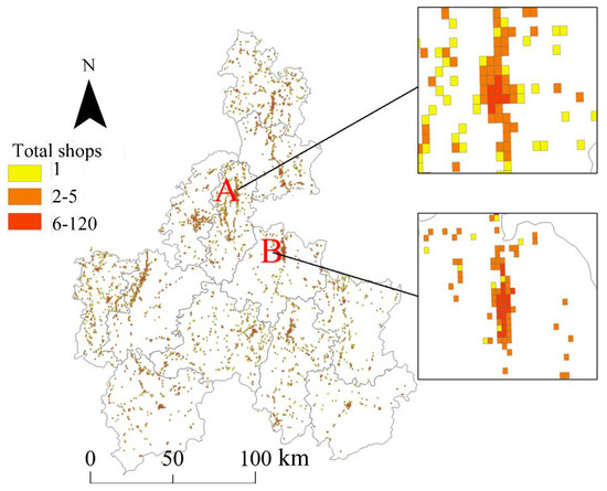 Figure 5 shows the distribution of retail shops, in which three grid colors are used to distinguish the number of shops within each grid. The number of shops ranges from 1 to 120. Red grids (more than five retail shops) are mainly distributed in the northwestern counties of Qiannan, including Longli County, Guiding County, and Changshun County. This result indicates that retail shops in these regions are more likely to be concentrated together than those in southeastern counties like Shandu County, Dushan County, and Libo County. Two sample regions, A and B, in Guiding County and Duyun County, respectively, are selected to show the details of the shop distribution. Most red grids show a concentrated pattern in the city center, whereas yellow grids and orange grids (a small number of shops) are dispersed far from the city center.