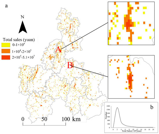 We use a curve to find out the relationship between grid-level retail sales and the number of grids, which shows a normal distribution pattern in Figure 6b. The results show that the retail sales for most grids are distributed from per month, which reflects the consumption level of most regions in Qiannan County. A few grids with high retail sales, larger than per month, are mainly distributed in the city center of the northwestern counties.
