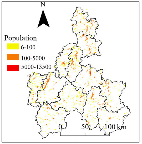 Figure 7 shows the distribution of the grid-level population, ranging from 6 to 13,505. Grids with high values, specifically larger than 5000, are mainly distributed in the northern and northwestern counties, including Wengan County, Longli County, Guiding County, Huishui County, and Changshun County.