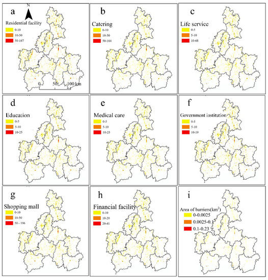 (a–h) Distribution of POI data and (i) area of geographic barriers in grid scale.