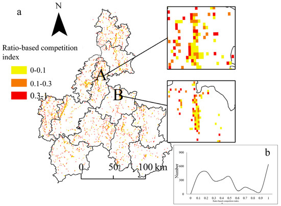 Figure 9a shows the distribution of the ratio-based competition index, ranging from 0–1. High-value grids with indexes larger than 0.3 are dispersedly distributed across the whole Qiannan City. However, the value of grids in the city center of retail concentrating counties, such as Guiding County, Longli County, and Huishui County, is small (<0.1). The enlarged views of sample regions A and B reveal the pattern. We further present the relationship between the ratio-based competition index and the number of grids in a formula, as shown in Figure 9b. The results show that the value of most grids is distributed between 0.1–0.5 and 0.9–1, whereas only a few grids are located in sections 0.6–0.9. The results potentially reveal a distribution pattern for the retail industry in Qiannan: most retail shops are either concentrated together, or are totally isolated from one another.