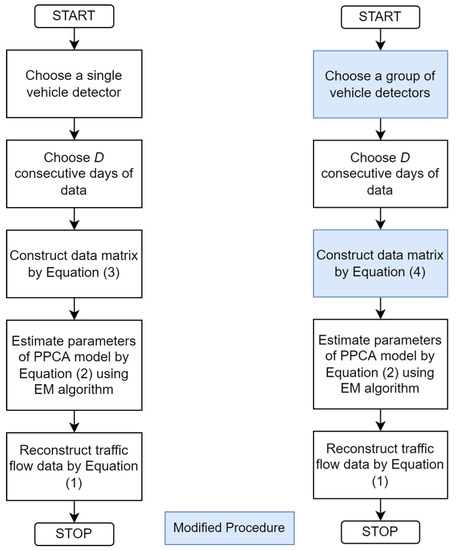 The proposed data matrix structure assumes that the traffic flow values in similar time slots over different detectors are implicitly correlated and follow a particular distribution. The method tries to recover the relationship between a group of vehicle detectors at different locations, utilizing both spatiotemporal information derived from traffic flow fluctuation of a particular vehicle detector and traffic flow information from other vehicle detectors in the network. As the method does not utilize traffic flow from neighboring days, there is no daily flow similarity requirement if the distribution derived from different vehicle detectors is preserved in the model. This can lead to better robustness in terms of traffic breakdown or burst. However, there are some caveats. The spatial correlation between different detectors typically decreases over distance. Additionally, in an urban network the vehicle detectors are not only separated by distance, but also separated by traffic lights located between detectors. Vehicle detectors can monitor different directions, even though their distance is close. Therefore, the choice of network and which detectors to put in the same network must be considered carefully. This is an important focus of this study. A comparison of the process flow for the single detector and spatiotemporal PPCA-based data imputation method is shown in Figure 2. The newly developed procedures are indicated in blue.